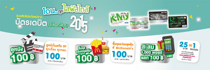 โดนทุกไลฟ์สไตล์ ด้วยสิทธิพิเศษจากบัตรเดบิตกสิกรไทย ประจำปี 2558 รวมสิทธิพิเศษทั้งดูหนังในเครือ SF ทุกเรื่อง ทุกรอบ ในราคา 100 บาท (จำกัด 2 ที่นั่ง/บัตร/เดือน), ซื้อชุดอร่อยสุดคุ้มที่ McDonald's ในราคา 100 บาท (จำกัด 1 ชุด/บัตร/เดือน) และสะสม 1,000 พอยท์ แลก 100 บาท ด้วยการลงทะเบียนสะสมแต้มและแลกของรางวัล (25 บาท = 1 คะแนน)