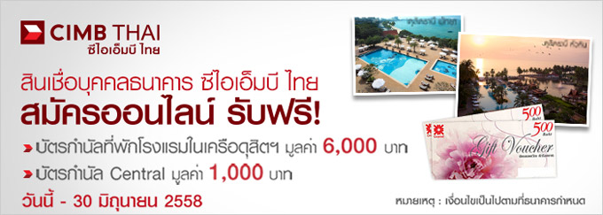 สมัครสินเชื่อออนไลน์กับ CIMB Thai รับฟรี! บัตรกำนัล Central หรือบัตรกำนัลที่พักในเครือดุสิต
