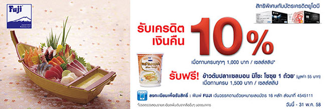 - รับเครดิตเงินคืน 10% เมื่อทานอาหารที่ FUJI ครบทุกๆ 1,000 บาทต่อเซลล์สลิป