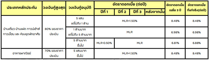 - กรณีที่ลูกค้าซื้อ MRTA อัตราดอกเบี้ยที่แท้จริงอาจเปลี่ยนแปลงไปจากนี้ได้ในกรณีที่ค่าเบี้ย MRTA มีการเปลี่ยนแปลงในภายหลัง