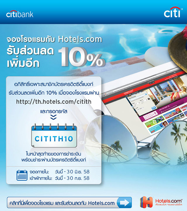 อภิสิทธิ์เฉพาะสมาชิกบัตรเครดิตซิตี้แบงก์ รับรหัสส่วนลด 10% สำหรับการจองห้องพักที่ hotels.com - เพียงทำรายการจองที่พักผ่านทาง http://th.hotels.com/citith