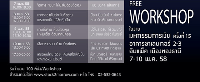 • Workshop เพื่อให้ความรู้และคำแนะนำด้านการลงทุนในแบบรู้ลึก รู้จริง และนำไปปฏิบัติ ได้แก่ ผู้เข้าชมงานในห้อง Workshop ที่จัดขึ้นเป็นพิเศษโดย stock2morrow ซึ่งมีหัวข้อการ Workshop ที่น่าสนใจมากมายตลอดทั้ง 4 วัน