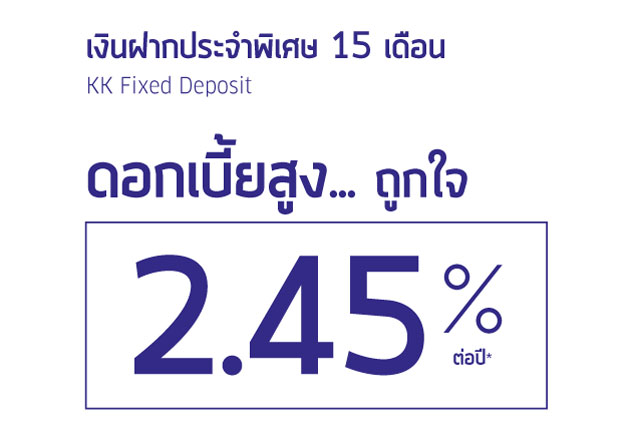 บัญชีเงินฝากประจำพิเศษ 15 เดือน สำหรับลูกค้าบุคลลธรรมดาที่มีอายุตั้งแต่ 15 ปีบริบูรณ์ขึ้นไป เปิดบัญชีครั้งแรกและฝากครั้งต่อไปขั้นต่ำ 5,000 บาท รับดอกเบี้ยสูง... ถูกใจ 2.45% ต่อปี