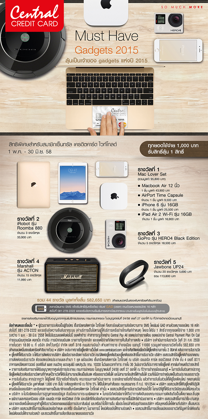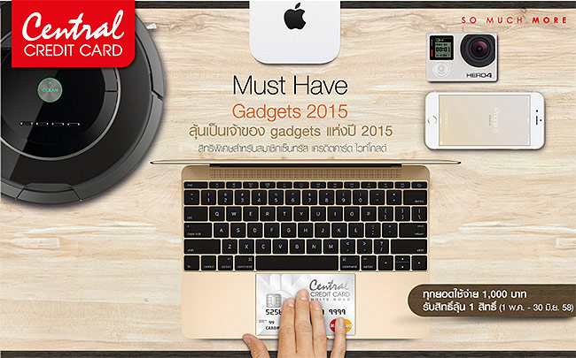 Must Have Gadgets 2015 ลุ้นเป็นเจ้าของ gadgets แห่งปี 2015 สิทธิพิเศษเฉพาะสมาชิกบัตร เซ็นทรัล เครดิตคาร์ด ไวท์โกลด์ รับสิทธิ์ลุ้นง่ายๆ เพียงใช้จ่ายผ่านบัตร ทุกยอด 1,000 บาท รับสิทธิ์ลุ้น 1 สิทธิ์