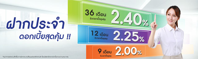 - ฝากประจำ 36 เดือน วงเงินฝากตั้งแต่ 1,000 บาท รับดอกเบี้ย 2.40% ต่อปี