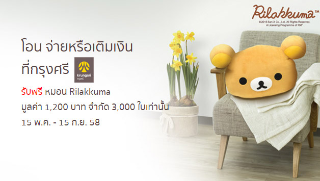 สะสมคะแนนครบ 30 คะแนน รับฟรี! "หมอน Rilakkuma" (ขนาด 22 x 14 นิ้ว) มูลค่า 1,200 บาท จำกัด 3,000 ใบเท่านั้น เมื่อ โอนเงินต่างธนาคาร (ORFT), ชำระค่าสินค้าและบริการ, เติมเงินมือถือ ผ่านช่องทาง กรุงศรีเอทีเอ็ม / กรุงศรีออนไลน์ / กรุงศรีโมบาย แอปพลิเคชั่น