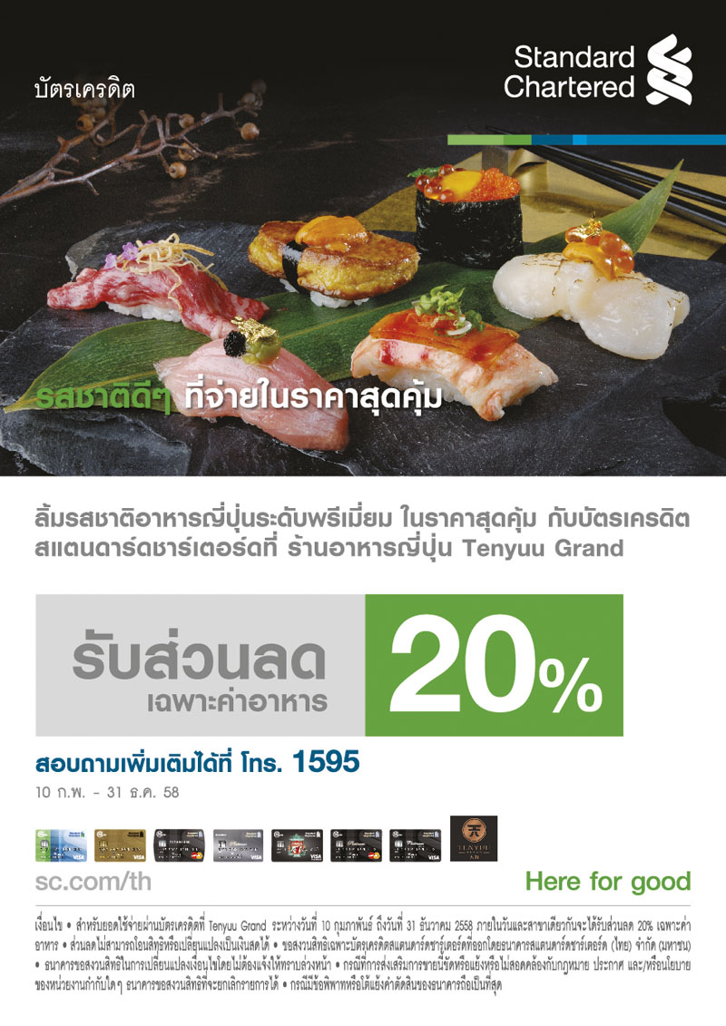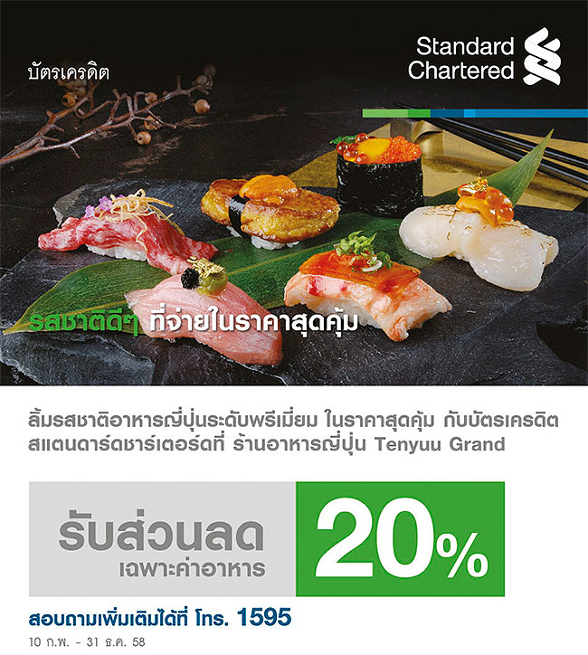 ลิ้มรสชาติอาหารญี่ปุ่นสุดพรีเมี่ยม ในราคาสุดคุ้ม กับบัตรเครดิตสแตนดาร์ดชาร์เตอร์ด ที่ร้านอาหาร Tenyuu Grand ลูกค้าบัตรเครดิตสแตนดาร์ด ชาร์เตอร์ด รับส่วนลด 20% (เฉพาะค่าอาหาร)