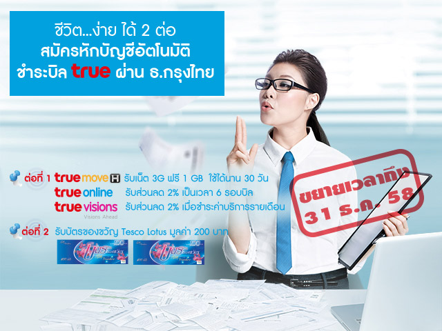 ชีวิต ... ง่าย ได้ 2 ต่อ ขยายเวลาสมัครหักบัญชีอัตโนมัติชำระบิล true ผ่าน ธ.กรุงไทย