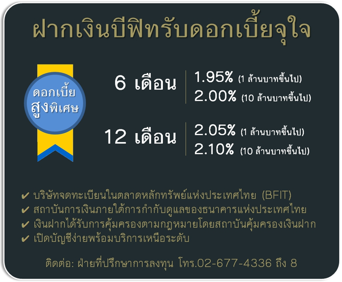 สอบถามรายละเอียดเพิ่มเติม ฝ่ายที่ปรึกษาการลงทุน โทร. 02-677-4336 ถึง 8 หรือ