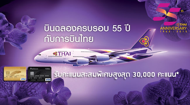 บินฉลองครบรอบ 55 ปี กับการบินไทย สมาชิกบัตรฯ เทสโก้ โลตัส วีซ่า รับคะแนนสะสมพิเศษสูงสุด 30,000 คะแนน เมื่อซื้อบัตรโดยสารของการบินไทย ที่