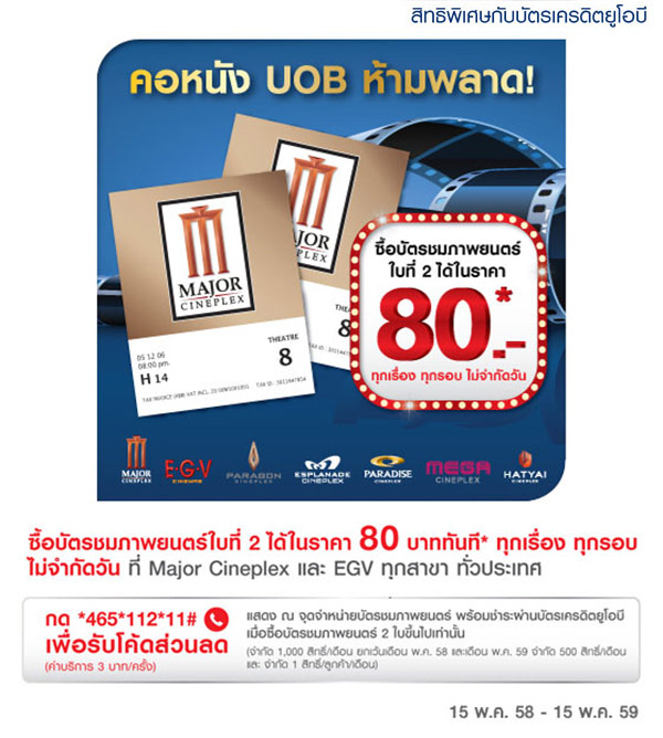 ลูกค้าบัตรเครดิต UOB ซื้อบัตรชมภาพยนตร์ใบที่ 2 ได้ในราคา 80 บาททันที ทุกเรื่อง ทุกรอบ ไม่จำกัดวัน ที่ Major Cineplex และ EGV ทุกสาขา ทั่วประเทศ