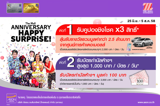 The Mall Happy Surprise (The Mall Anniversary) ช้อปที่เดอะมอลล์ด้วยบัตรเครดิตอิออน รับสิทธิพิเศษเพิ่ม 2 ต่อ - ต่อที่ 1 รับสิทธิ์ x 3 ลุ้นรางวัลรถยนต์ Toyota รุ่น Corolla Altis จำนวน 2 รางวัล รวมมูลค่า 2,138,000 บาท และ โทรศัพท์ Samsung S6 EDGE จำนวน 15 รางวัล รวมมูลค่า 418,500 บาท จากศูนย์การค้าเดอะมอลล์ เมื่อใช้จ่ายสะสมทุก 2,000 บาท/ บัตร/ วัน
