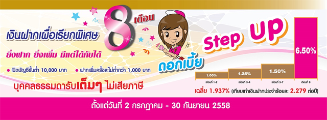 บัญชีเงินฝากเผื่อเรียกพิเศษ 8 เดือน เป็นบัญชีสำหรับลูกค้าบุคคลธรรมดาอายุตั้งแต่ 7 ปีขึ้นไป และนิติบุคคล ฝากขั้นต่ำเพียง 10,000 บาท รับอัตราดอกเบี้ย Step Up สูงสุด 6.50% ต่อปี
