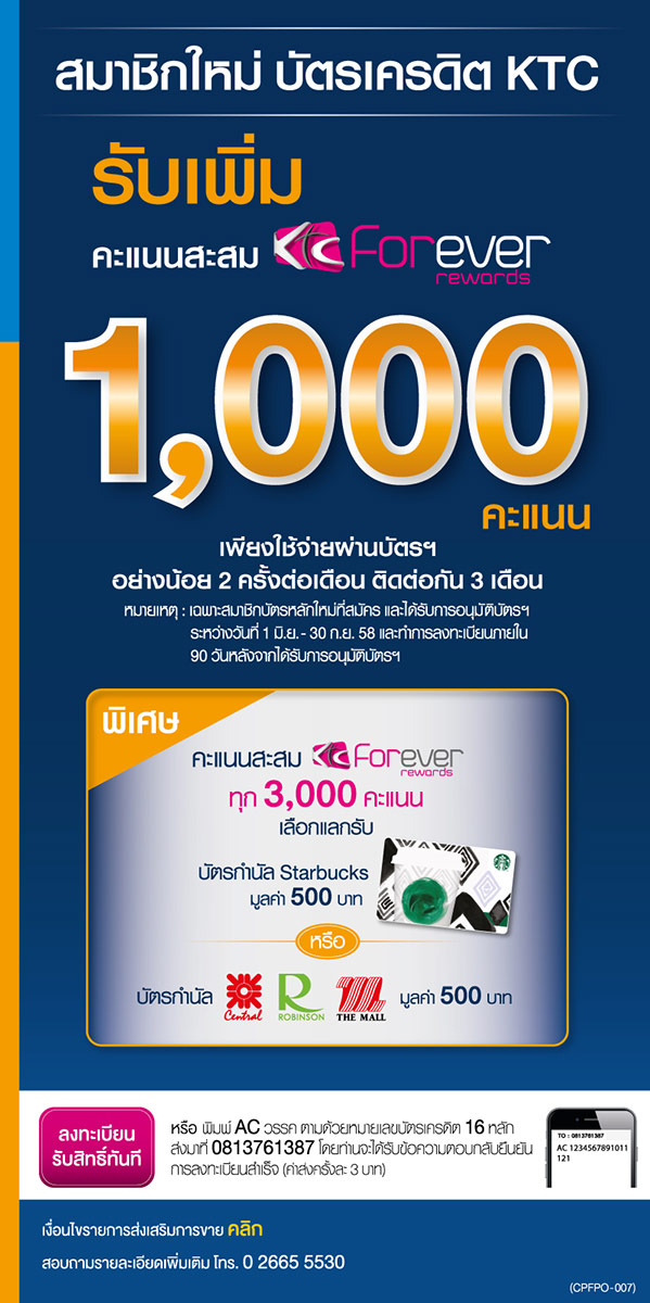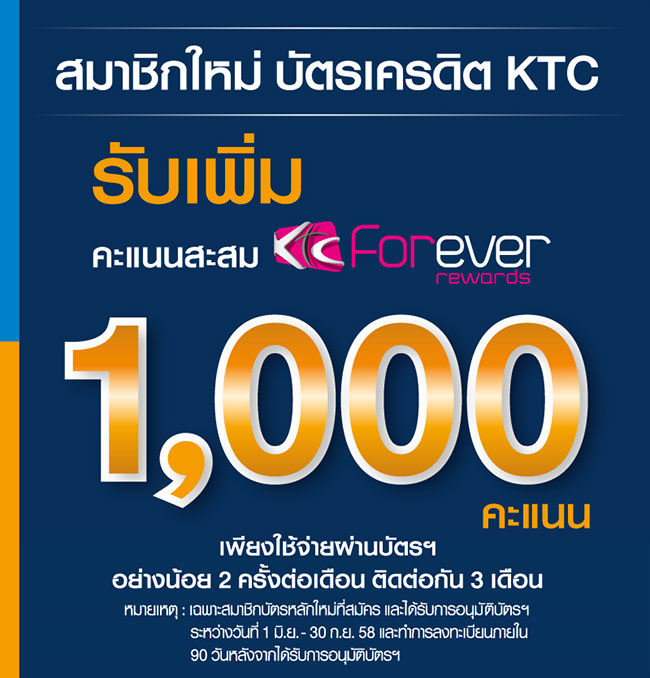 สมาชิกใหม่ บัตรฯ KTC รับเพิ่มคะแนนสะม Forever Rewards 1,000 คะแนน เพียงใช้จ่ายผ่านบัตรฯ อย่างน้อย 2 ครั้งต่อเดือน ติดต่อกัน 3 เดือน (เฉพาะสมาชิกบัตรหลักใหม่ที่สมัคร และได้รับการอนุมัติบัตรฯ ระหว่างวันที่ 1 มิ.ย. - 30 ก.ย. 58 และทำการลงทะเบียนภายใน 90 วันหลังจากได้รับการอนุมัติบัตรฯ)