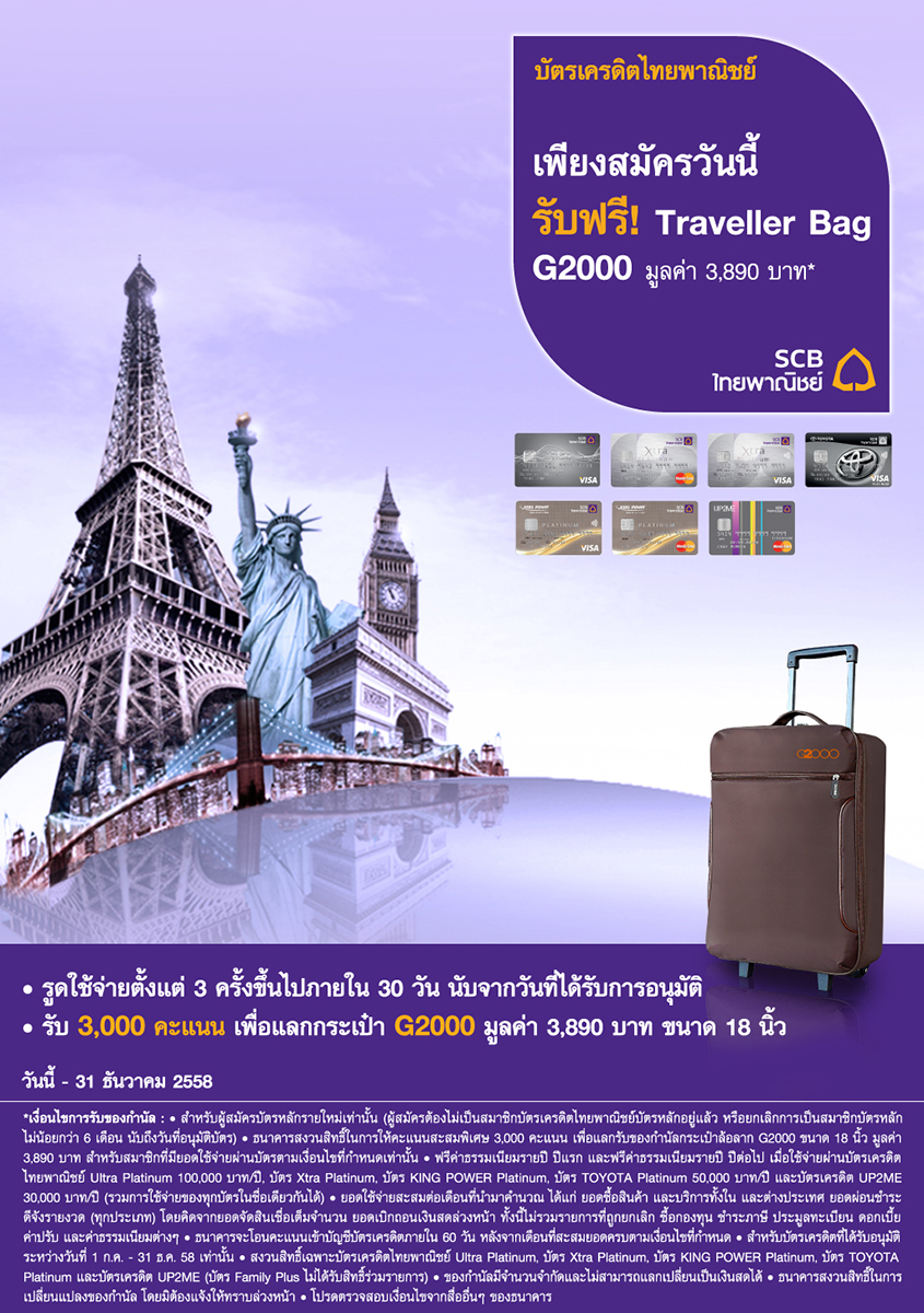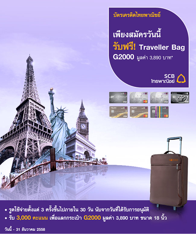 สมัครบัตรเครดิต SCB วันนี้ รับฟรี! Traveller Bag G2000 มูลค่า 3,890 บาท