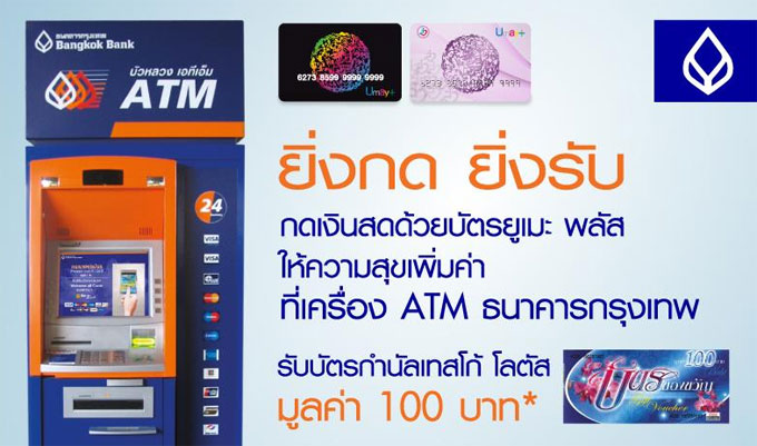 เมื่อกดเงินสดด้วยบัตรยูเมะ พลัส และยูเมะ พลัส พรีเมียร์ ที่เครื่อง ATM ธนาคารกรุงเทพ และมีจำนวนรายการกดเงินสดสูงสุด 300 ท่านแรก/เดือน รับบัตรกำนัลเทสโก้ โลตัส มูลค่า 100 บาท ตั้งแต่ 1 ก.ค. - 31 ธ.ค. 58