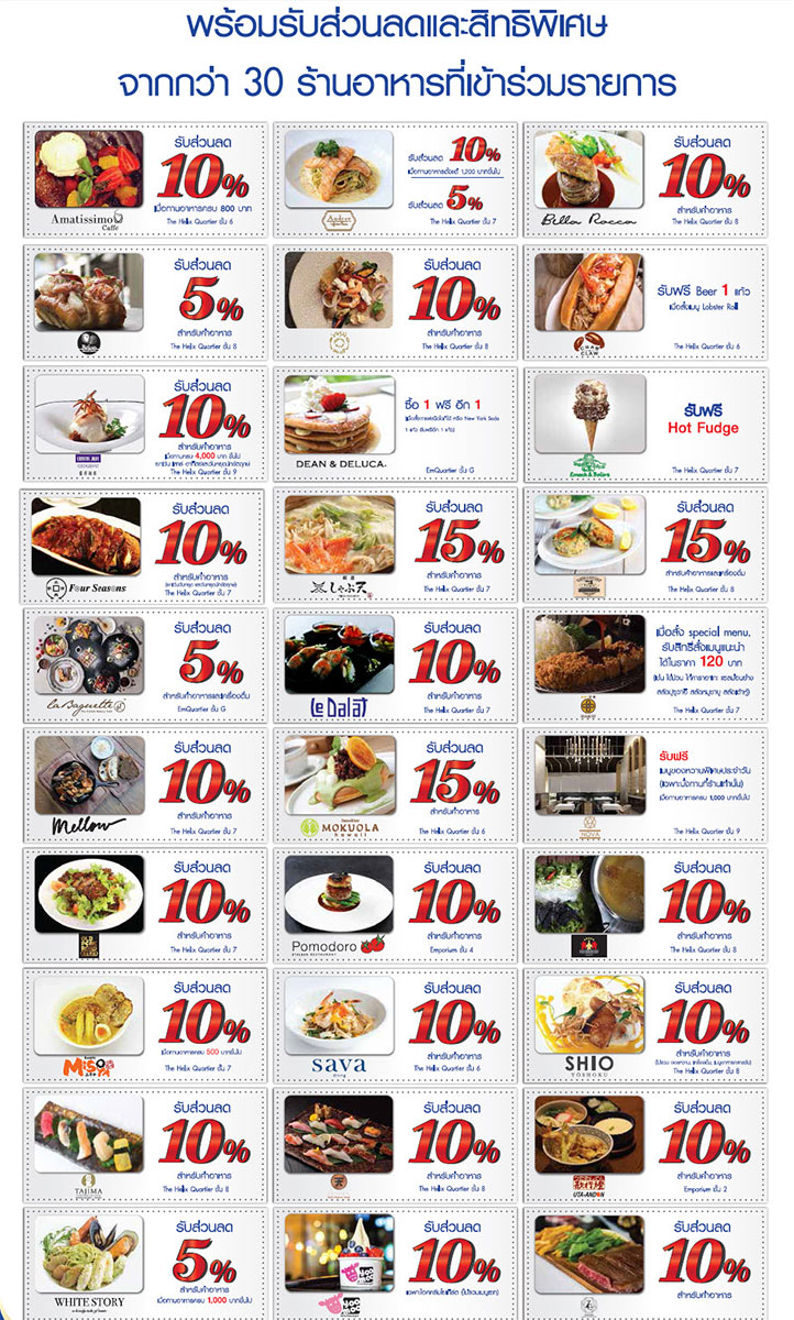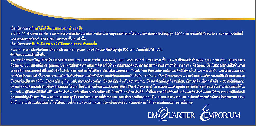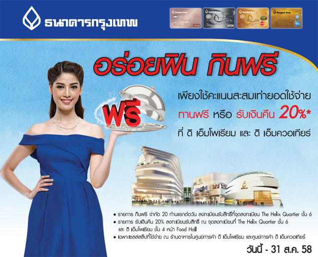 อร่อยฟิน กินฟรี กับบัตรเครดิตธนาคารกรุงเทพ ที่ดิ เอ็มโพเรียม และดิ เอ็มควอเทียร์ สิทธิพิเศษสำหรับผู้ถือบัตรเครดิตธนาคารกรุงเทพ เพียงใช้คะแนนสะสมเท่ายอดใช้จ่าย ทานฟรี หรือรับเงินคืน 20% เฉพาะเซลล์สลิปที่ใช้จ่าย ณ ร้านอาหารในศูนย์การค้า ดิ เอ็มโพเรียม และศูนย์การค้า ดิ เอ็มควอเทียร์