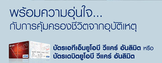 ข้อกำหนดและเงื่อนไข : - เงื่อนไขความคุ้มครองอุบัติเหตุของบัตรยูโอบี วีแคร์ รวมถึงค่าธรรมเนียมของบัตรเอทีเอ็ม ยูโอบี วีแคร์ อันลิมิต/เดบิต ยูโอบี วีแคร์ อันลิมิต และ/หรือ เดบิตยูโอบี วีแคร์ เอ็กซ์ตร้า อันลิมิต ให้เป็นไปตามประกาศอัตราค่าธรรมเนียม ณ ขณะนั้น ท่านสามารถตรวจสอบอัตราค่าธรรมเนียมปัจจุบันและสิทธิประโยชน์ของบัตรแต่ละประเภทได้ที่ www.uob.co.th