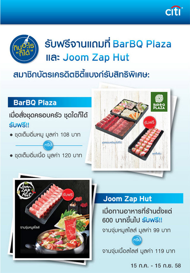 กินอะไรก็ได้ ... รับฟรีจานแถม ที่ Bar B Q Plaza และ Joom Zap Hut สิทธิพิเศษสมาชิกบัตรฯ Citibank