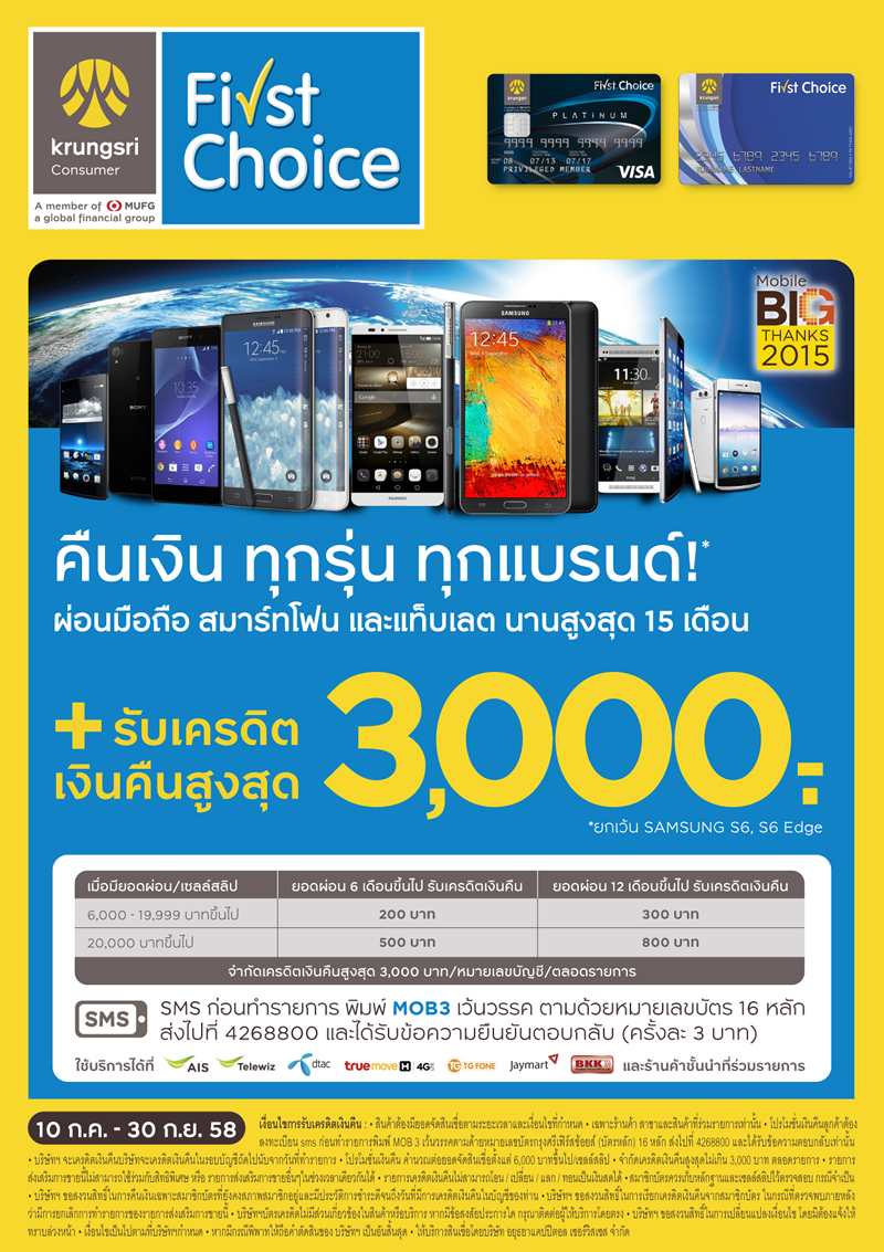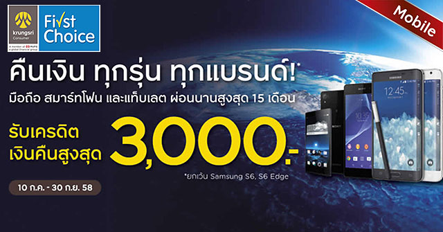 คืนเงินทุกรุ่น ทุกแบรนด์ มือถือ สมาร์ทโฟน และแท็บเล็ต กับบัตรฯ กรุงศรีเฟิร์สช้อยส์ฯ สูงสุด 3,000 บาท