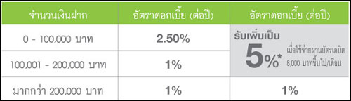 - ธนาคารจะจ่ายดอกเบี้ยเป็นอัตราก้าวหน้า ตามที่ธนาคารประกาศไว้ ซึ่งจะคำนวณจากยอดคงเหลือเป็นรายวันในแต่ละวัน และจะแบ่งจ่ายดอกเบี้ยทุกต้นเดือน