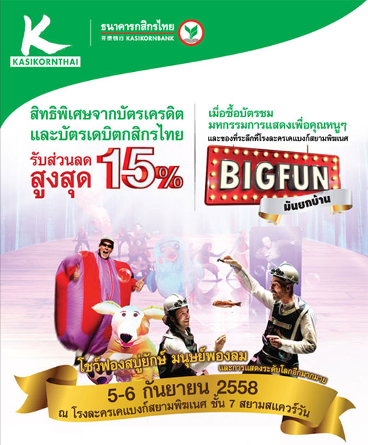 ธนาคารกสิกรไทยมอบสิทธิพิเศษจากบัตรเดบิต และบัตรเครดิตกสิกรไทย เมื่อซื้อบัตรชมมหกรรมการแสดงเพื่อคุณหนูๆ และของที่ระลึกที่โรงละครเคแบงก์สยามพิฆเนศ BIGFUN มันยกบ้าน กับการโชว์ฟองสบู่ยักษ์ มนุษย์พองลม และการแสดงระดับโลกอีกมากมาย ในวันที่ 5 - 6 กันยายน 2558 ณ โรงละครเคแบงก์สยามพิฆเนศ ชั้น 7 สยามสแควร์วัน ซื้อบัตรได้ที่เคาน์เตอร์ไทยทิคเก็ตเมเจอร์ทุกสาขา และ