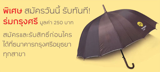 พิเศษ! สมัครวันนี้ รับทันที ร่มกรุงศรี มูลค่า 250 บาท สมัครและรับสิทธิ์ก่อนใคร ได้ที่ธนาคารกรุงศรีอยุธยาทุกสาขา