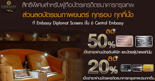 สิทธิพิเศษสำหรับผู้ถือบัตรเครดิตธนาคารกรุงเทพ กับส่วนลดบัตรชมภาพยนตร์ ทุกรอบ ทุกที่นั่ง ที่ Embassy Diplomat Screens ชั้น 6 Central Embassy - ลด 50% เมื่อชำระผ่านบัตรอินฟินิท และบัตรผู้นำแพลทินัม