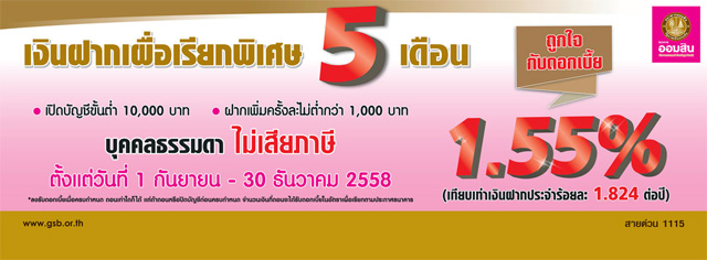 เงินฝากเผื่อเรียกพิเศษ 5 เดือน กับดอกเบี้ยถูกใจ 1.55% ต่อปี จาก ธ.ออมสิน