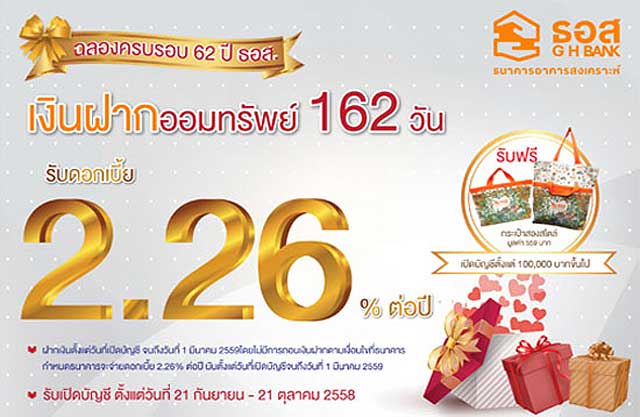 บัญชีเงินฝากออมทรัพย์ 162 วัน โปรโมชั่นเงินฝากฉลองครบรอบ 62 ปี ธอส. สำหรับลูกค้าบุคคลธรรมดา ฝากเริ่มต้นเพียง 1,000 บาท รับเปิดตั้งแต่วันนี้ - 21 ตุลาคม 2558