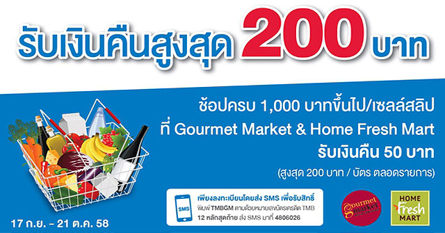 บัตรเครดิต TMB ให้เงินคืนสูงสุด 200 บาท ที่ Gourmet Market & Home Fresh Mart เพียงช้อปครบ 1,000 บาทขึ้นไป/เซลล์สลิป รับเงินคืน 50 บาท (สูงสุด 200 บาท/ บัตรตลอดรายการ)