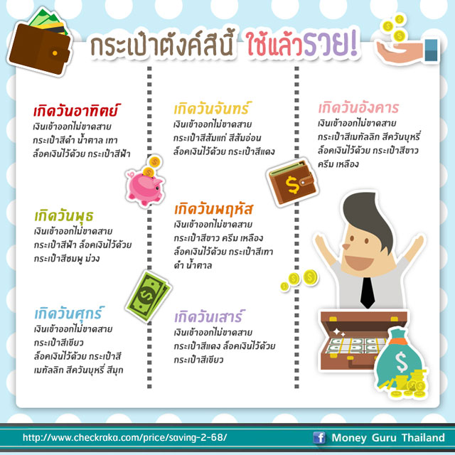 นอกจากจะทำงานเพื่อหาเงินแล้ว การเลือกกระเป๋าตังค์สวยๆ สักใบเพื่อเก็บเงินก็เป็นสิ่งจำเป็น เพราะนอกจากจะเป็นที่เก็บเงินแล้ว ยังสามารถเก็บบัตรต่างๆ ได้อีกมากมาย แต่วันนี้เราจะมาโฟกัสกันที่ "เงิน" ว่าจะเลือกกระเป๋าตังค์สีอะไรให้เหมาะกับเรา และถูกโฉลกกับเราที่สุด โดยเลือกตามวันเกิด สีที่เรานำมาให้คุณเลือกนั้นถอดทุกอย่างมาจากหลักทักษาศาสตร์โบราณที่รุ่นคุณปู่คุณย่ารับประกันความเวิร์คกันมาแล้ว คอนเซปท์นี้คือ "ดึงเงินเข้า และกันเงินออก"