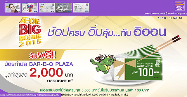 เมื่อสะสมยอดใช้จ่ายผ่านบัตรเครดิตที่ร่วมรายการ ครบทุก 5,000 บาทขึ้นไป รับทันทีบัตรกำนัล BAR-B-Q PLAZA มูลค่า 100 บาท โดยนับสิทธิ์สะสมให้เฉพาะยอดใช้จ่ายตั้งแต่ 1,500 บาทขึ้นไป/ เซลล์สลิป เท่านั้น (มีสิทธิ์รับบัตรกำนัลสูงสุด 1,000 บาท/ หมายเลขบัตร/ รอบบัญชี หรือไม่เกิน 2,000 บาทตลอดรายการ)