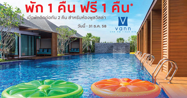 รับสิทธิพิเศษกับบัตรเครดิต กรุงศรี พัก 1 คืน ฟรี 1 คืน ที่โรงแรม Vann Hua Hin เมื่อพักติดต่อกัน 2 คืน สำหรับห้องพูลวิลล่า (เฉพาะ บัตรเครดิต กรุงศรี เอ็กซ์คลูซีฟ ซิกเนอเจอร์, บัตรเครดิต กรุงศรี ซิกเนอเจอร์, บัตรเครดิต กรุงศรี แพลทินัม)