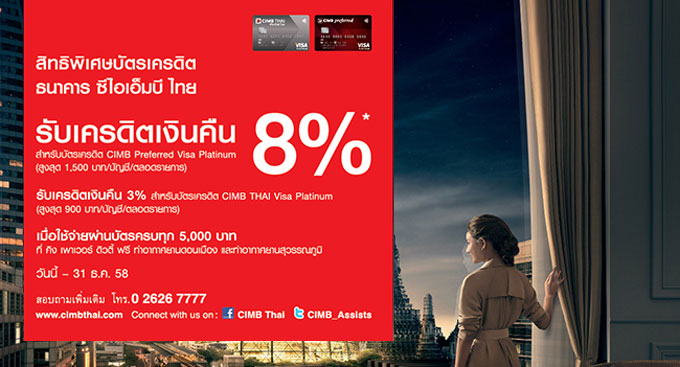 - รับเครดิตเงินคืน 3% สำหรับบัตรเครดิต CIMB THAI Visa Platinum (สูงสุด 900 บาท/บัญชี/ตลอดรายการ)