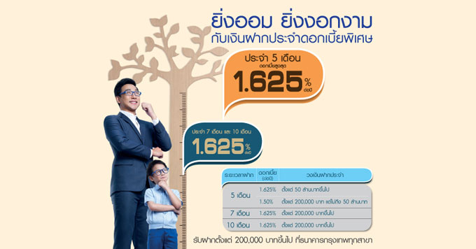 | บัญชีเงินฝากประจำ 7 เดือน | 1.625% ต่อปี | ตั้งแต่ 200,000 บาทขึ้นไป |