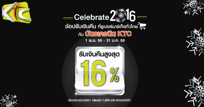 ฉลองรับปีใหม่ 2016 เพียงช้อปผ่านบัตรเครดิต KTC ครบทุก 1,500 บาท ต่อเซลส์สลิป ที่ซูเปอร์มาร์เก็ตทุกที่ทั่วไทย รับเงินคืนสูงสุดถึง 16%