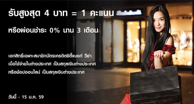 อภิสิทธิ์เฉพาะสมาชิกผู้ถือบัตรเครดิตซิตี้แบงก์ วีซ่า เมื่อใช้จ่ายในต่างประเทศเป็นสกุลเงินต่างประเทศ หรือช้อปออนไลน์เป็นสกุลเงินต่างประเทศ รับสูงสุด 4 บาท = 1 คะแนน หรือผ่อนชำระ 0% นาน 3 เดือน