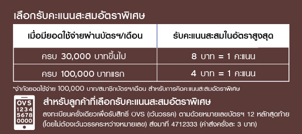 - การให้คะแนนพิเศษของโปรโมชั่นนี้จะคำนวณจากยอดการใช้จ่ายทั้งหมดรวมทั้งบัตรหลักและบัตรเสริมทุกๆ 10,000 บาท เฉพาะส่วนที่ไม่เกิน 100,000 บาท/เดือน/ลูกค้า (ทุกบัตรรวมกัน) โดยคำนวณรวมกับคะแนนสะสมปกติตามประเภทของบัตรที่มียอดใช้จ่ายสูงสุดจนครบจำนวนเท่าที่กำหนด ยอดใช้จ่ายเกิน 100,000 บาท จะได้รับคะแนนสะสมในอัตราปกติ