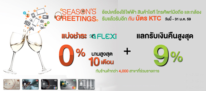สิทธิพิเศษสำหรับสมาชิกบัตร KTC วันนี้กับเทศกาล SEASON'S GREETINGS ที่ให้คุณได้แบ่งชำระ FLEXI 0% นานสูงสุด 10 เดือน พร้อมลุ้นรับโชค 2 ต่อ