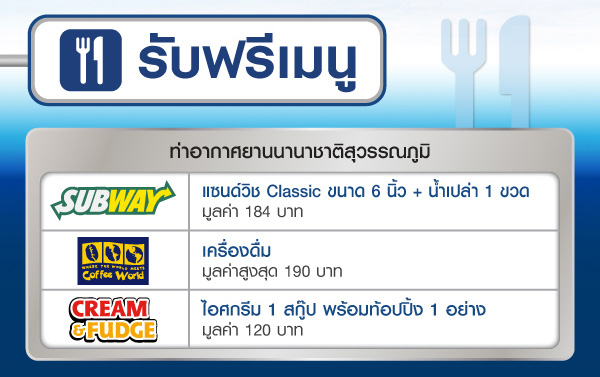 บัตรเครดิตซิตี้ เลือกรับเซ็ตเมนูฟรีง่ายๆ เพียงแสดงบัตรฯ ของท่าน ณ ร้านอาหารที่ร่วมรายการ ที่ท่าอากาศยานนานาชาติสุวรรณภูมิ และท่าอากาศยานดอนเมือง รายละเอียดโปรโมชั่น ดังนี้