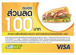 ฟรี! คูปองส่วนลด 100 บาท สำหรับการซื้อเครื่องดื่ม/ของว่างเมนูใดก็ได้ ที่มีมูลค่าตั้งแต่ 100 บาทขึ้นไป และชำระส่วนต่างด้วยบัตรวีซ่า เดบิต TMB ที่ Coffee World, New York 5th Avenue Deli, Cream & Fudge : เฉพาะสาขาในสนามบินสุวรรณภูมิ Concourse B(East) และ Concourse F(West) ชั้น 4 Subway : เฉพาะสาขาในสนามบินสุวรรณภูมิ Concourse B(East), Food Stop Concourse A และสนามบินดอนเมือง