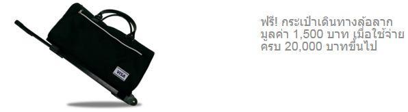 ฟรี! กระเป๋าเดินทาง ใช้จ่ายด้วยบัตรวีซ่า เดบิต TMB ในต่างประเทศ ระหว่างวันที่ 15 ธันวาคม 2558 - 30 กันยายน 2559 แลกรับกระเป๋าเดินทาง ฟรี 1 ใบ