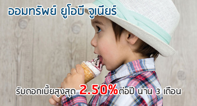 เปิดบัญชีใหม่ ให้ลูกรัก ออมทรัพย์ ยูโอบี จูเนียร์ ระหว่างวันที่ 9 - 31 มกราคม 2559 รับดอกเบี้ยสูงสุด 2.50% ต่อปี นาน 3 เดือน พร้อมรับบัตรกำนัล Swensen's มูลค่าสูงสุด 100 บาท