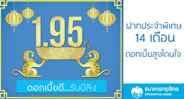 บัญชีเงินฝากประจำพิเศษ 14 เดือน จ่ายดอกเบี้ยทุกเดือน รับดอกเบี้ยสูงสุด 1.95% ต่อปี จาก ธ.กรุงไทย