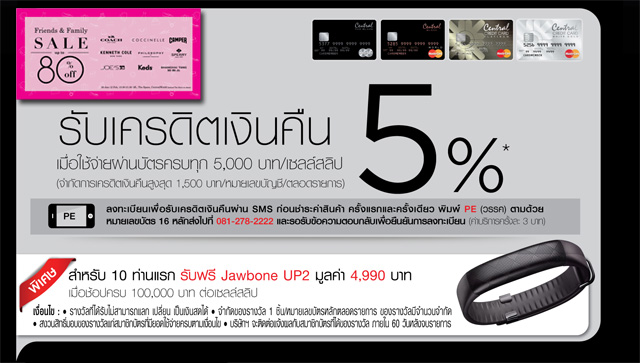 "Friends & Family Sale" ลดสูงสุด 80% ภายในงาน และสิทธิพิเศษสำหรับสมาชิกเซ็นทรัล เครดิตคาร์ด รับเครดิตเงินคืนสูงสุด 5% เมื่อใช้จ่ายผ่านบัตรครบทุก 5,000 บาท/เซลส์สลิป (จำกัดการคืนเงินสูงสุด 1,500 บาท/หมายเลขบัญชี/ตลอดรายการ)