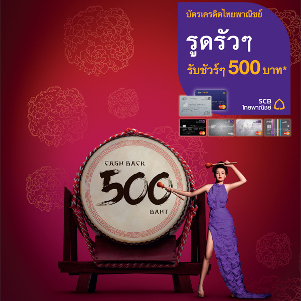รูดรัวๆ รับชัวร์ๆ 500 บาท เมื่อมียอดใช้จ่ายขั้นต่ำ 1,500 บาท จากบัตรเครดิตไทยพาณิชย์