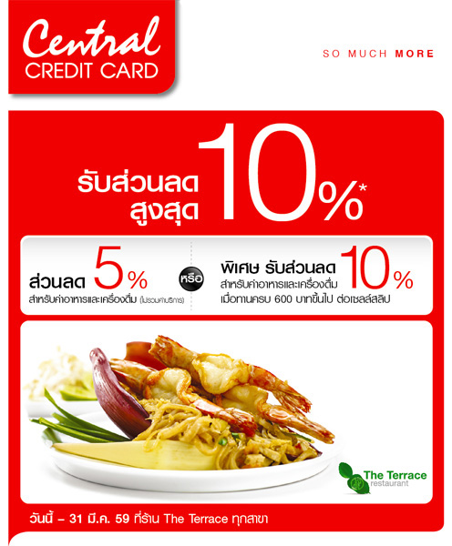 สิทธิพิเศษสำหรับสมาชิกบัตรเซ็นทรัล เครดิตคาร์ด ทุกประเภท รับส่วนลดสูงสุด 10% เมื่อรับประทานอาหารที่ร้าน The Terrace ทุกสาขา