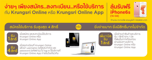 Krungsri Digital banking แค่ใช้ออนไลน์ก็ได้ iPhone ง่ายๆ เพียงสมัคร... ลงทะเบียน... หรือใช้บริการกับ Krungsri Online หรือ Krungsri Online App ลุ้นรับฟรี! iPhone6s (16GB) จำนวน 2 รางวัล รวมมูลค่า 53,800 บาท