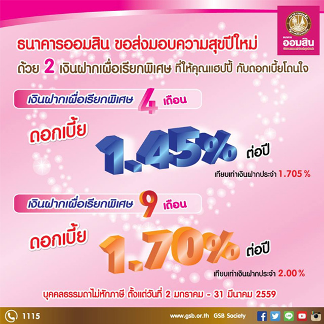 ธนาคารออมสินเปิดรับฝากเงิน บัญชีเงินฝากเผื่อเรียกพิเศษ 4 เดือน และ บัญชีเงินฝากประจำพิเศษ 9 เดือน ให้ดอกเบี้ยสูงสุด 1.700% ต่อปี สามารถฝากได้ทั้งผู้ฝากประเภทบุคคลธรรมดาอายุตั้งแต่ 7 ปีขึ้นไป และนิติบุคคลทุกประเภท เปิดบัญชีขั้นต่ำ 10,000 บาท